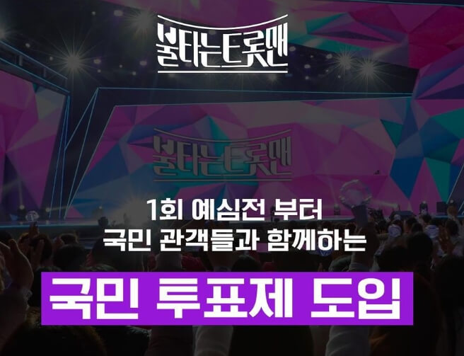 미스터트롯2와 다르게 불타는 트롯맨은 국민대표단을 모집해서 투표를 진행합니다. 본선 경연무대만 보여주던 기존 오디션 프로그램과 달리 예심부터 방영하고 있습니다. 불타는 트롯맨 투표는 본선경기부터 치러지며 온라인으로 응원투표 참여 가능합니다. 아래 카톡 친구추가 하세요.